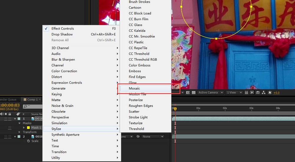 3、在上层视频素材中,将要进行马赛克的区域圈画出来,然后为其添加如图所示的马赛克特效