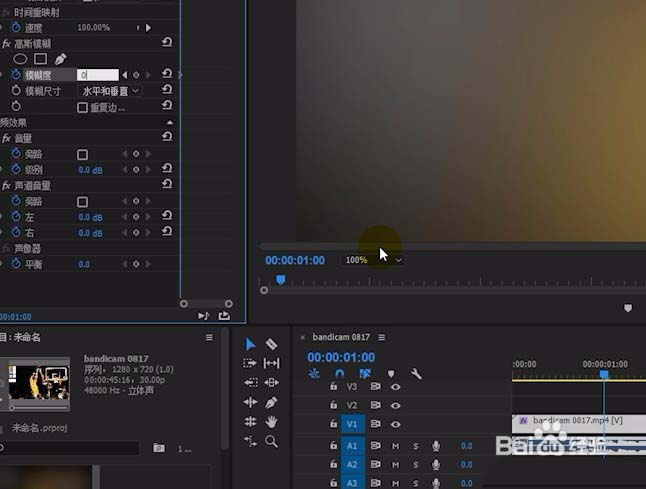 3、将时间线设置到视频起始端打上高斯模糊的关键帧,并将模糊度设置为600。
