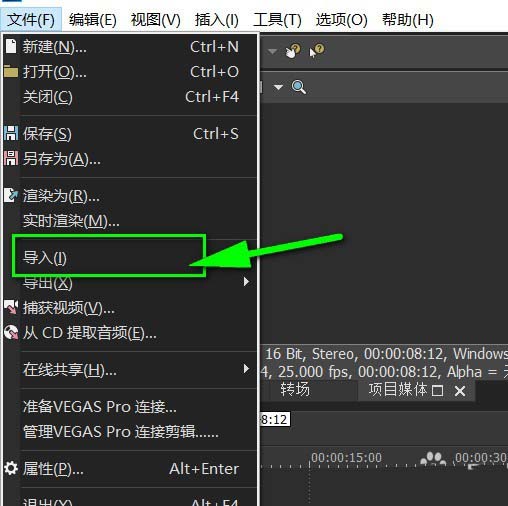 4、此外vegas的文件菜单下也会有“导入”的功能选项滴。