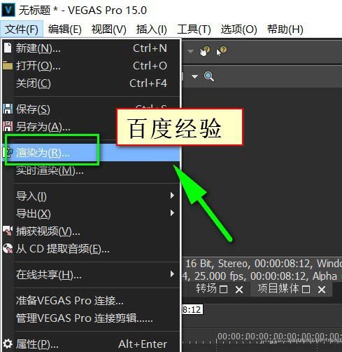5、在vegas中渲染视频则是用到文件菜单中的“渲染”按钮的。