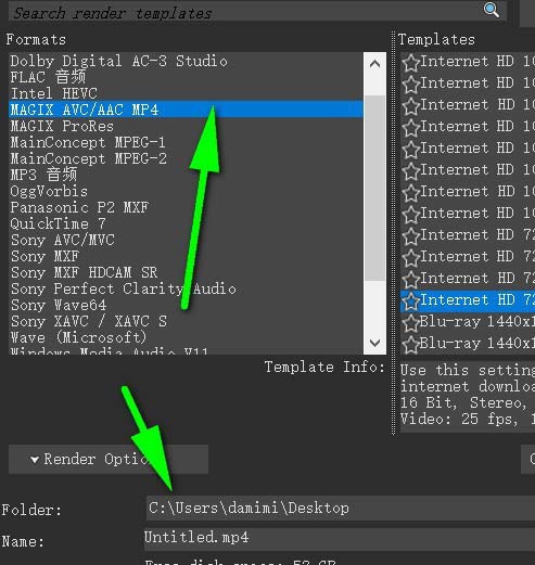 6、选择要把视频媒体渲染成为哪种格式并且指定渲染输出位置即可。