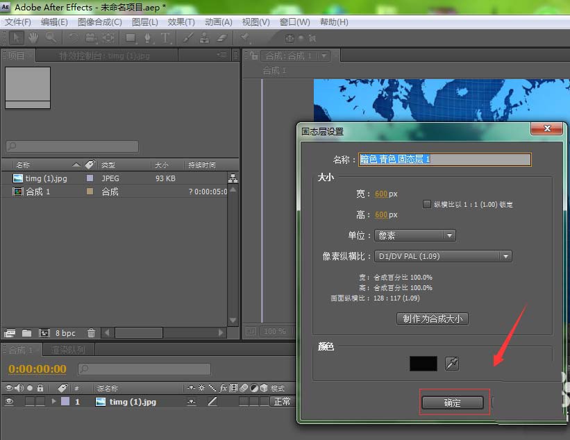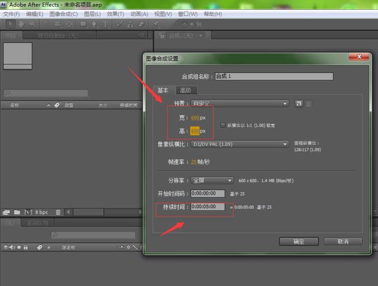 1、打开ae,新建一个600x600的合成,持续时间为5秒,其他默认即可