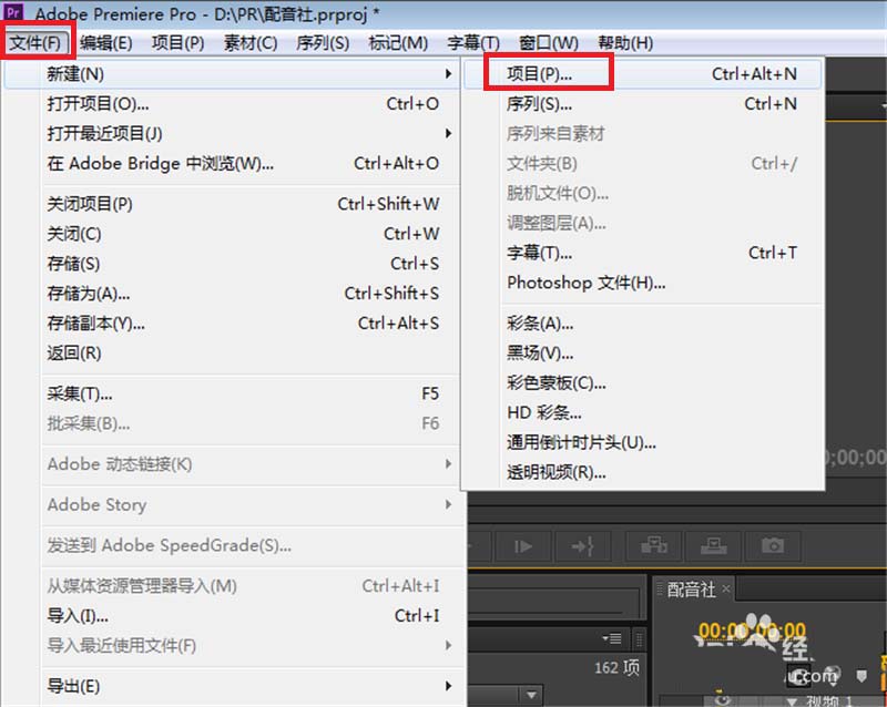 2、单击软件左上角的〖文件〗—〖新建〗—〖项目〗,如果最近有使用PR,直接在弹出的窗口中单击〖新建项目〗;