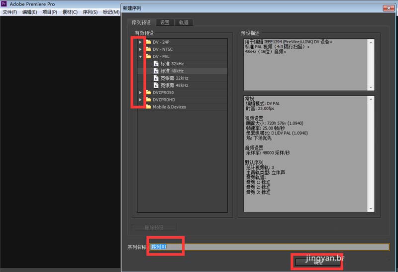 4、在〖新建序列〗中选择一个比较接近你视频属性的有限预设,填写好序列名称后点击〖确定〗;
