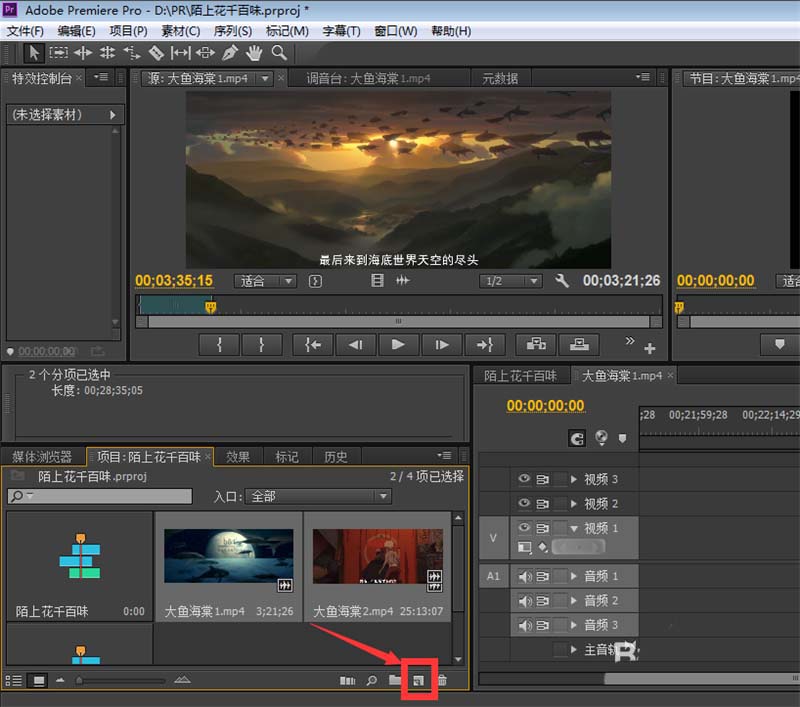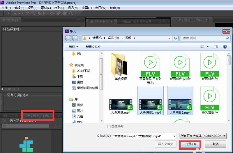 5、单击〖项目〗窗口里的任意空白位置,将你要添加过渡特效的视频添加到PR中;