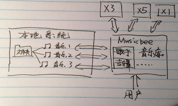 如图所示,musicbee和itunes一样,尽量不让用户接触windows资源管理器,而专心到音乐本身的整理。所有硬盘上的资源都映射到了musicbee的音乐库。可以理解为,库就是硬盘。库中的音乐按艺术家和专辑名整理,当然你依然可以细化其他分类形式,比如风格,年代,等等。软件会自动将硬盘上的文件按你设定的方式整理。你在库里的任何增删改,都会反映到对应的文件上。所有播放器,都相当于一个库的一个拷贝:把库掰下来一块带身上走。同步操作定义了播放器里包含了库里哪些音乐,然后播放器在同步时会删掉不在同步列表里的,增加列表里新加的音乐。