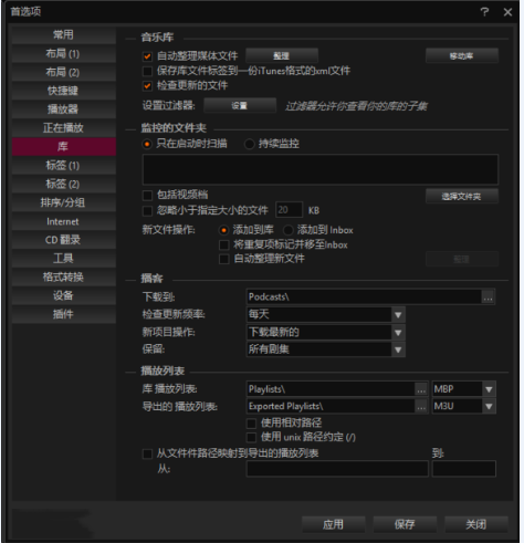 注意勾选“自动整理媒体文件”和“检查更新的文件”。这样就可以在操作库里音乐的时候,软件自动整理系统里的文件和文件夹。新文件操作选“添加到库”。