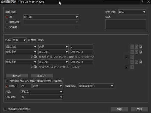 自动播放列表是是音乐管理工具必不可少的功能,它会根据指定的条件自动进行动态更新。例如,如果要欣赏某个艺术家早期的音乐,您可以创建一个自动播放列表,规则中指定艺术家和发行时间区间,自动播放列表就会把符合规则的歌曲添加进来,并且当音乐库中新添加了符合规则的音乐,也会更新到自动列表。