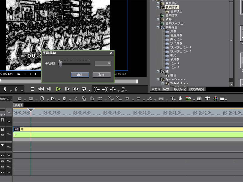 5、接着拖拽平滑模糊到视频轨道上,调出平滑模糊对话框,设置半径为5像素,点击确定按钮。