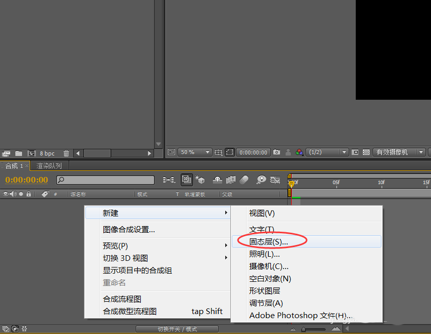 1、在时间线的图层面板空白区域,右击鼠标选择“新建>固态层”。