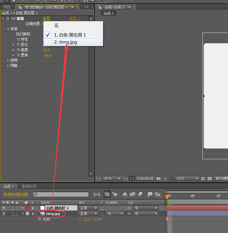 1、选择固态层,进入“特效控制台”,设定 “CC 玻璃”效果表面的“凹凸映射”属性为刚导入到图层面板的图片名称。
