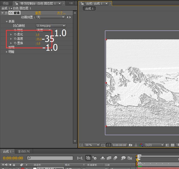 2、调整CC 玻璃效果属性参数,使画面转为浮雕艺术效果。