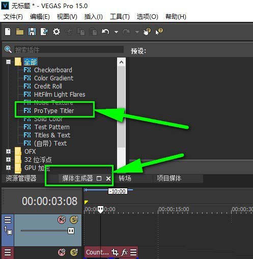 2、然后点击媒体生成器便可以看到vegas左侧的一些字幕菜单了哦。