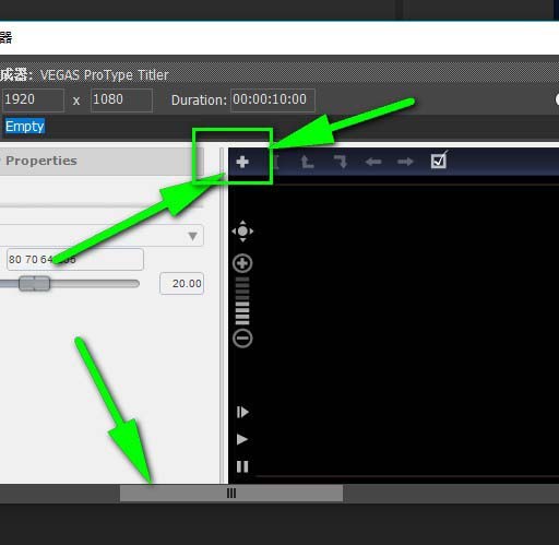 4、接着便会弹出vegas字幕添加和设置面板了哦。点击下方的滚动条以此来滑动字幕面板即可看到一个加号用来添加字幕哦。