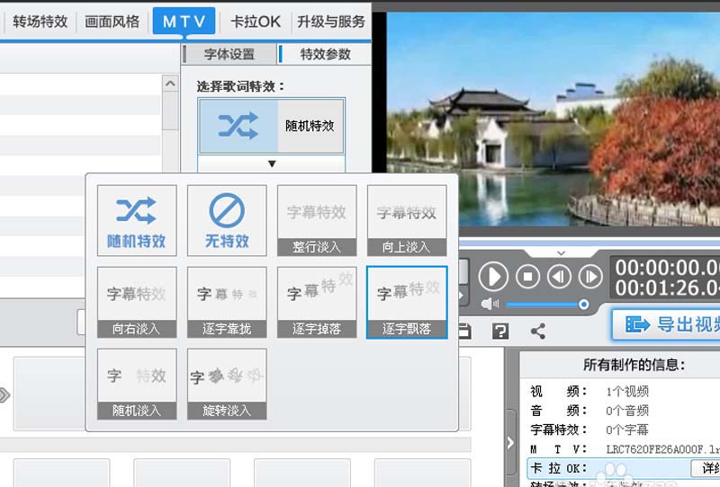 6、特效参数设置为逐字飘落,播放查看效果,执行导出视频命令,将文件导出即可。
