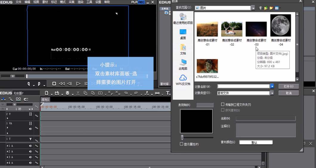 1、双击素材库面板,选择相应的图片点击“打开”。