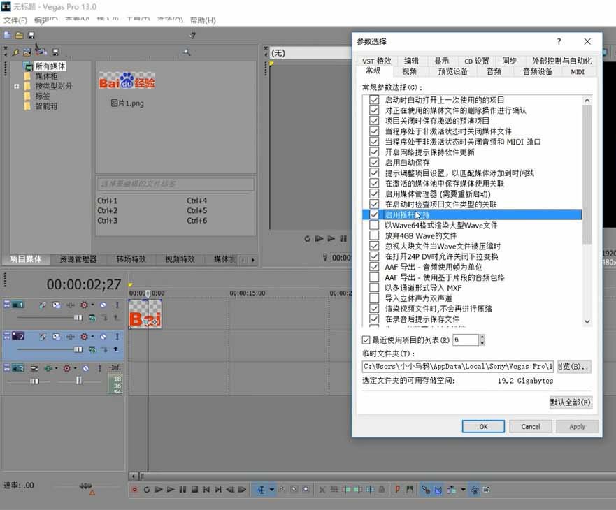 2、在弹出的“参数选择”对话框中选择“常规”选项卡,可以看到第12项就是“启用摇杆支持”。