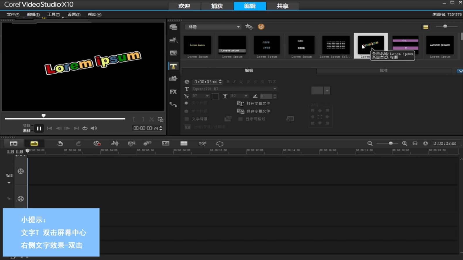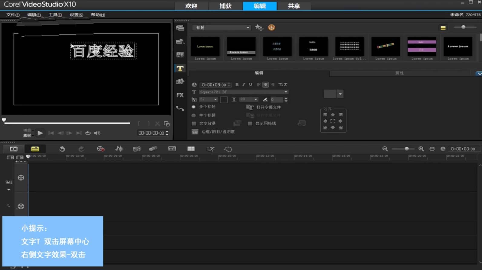 方法一:首先打开会声会影,点击工具栏中的文字“T”,在屏幕中心双击即可添加标题。