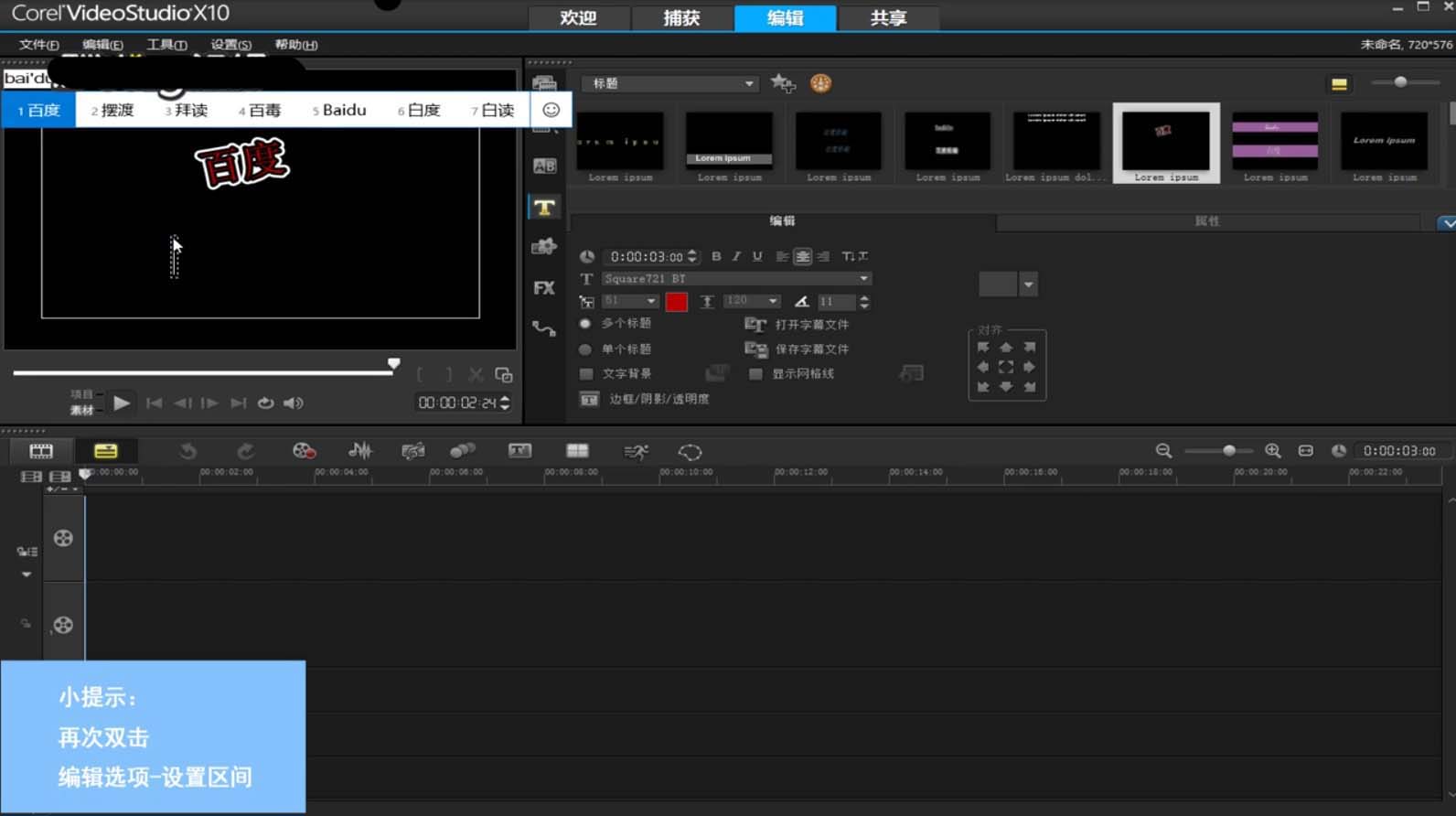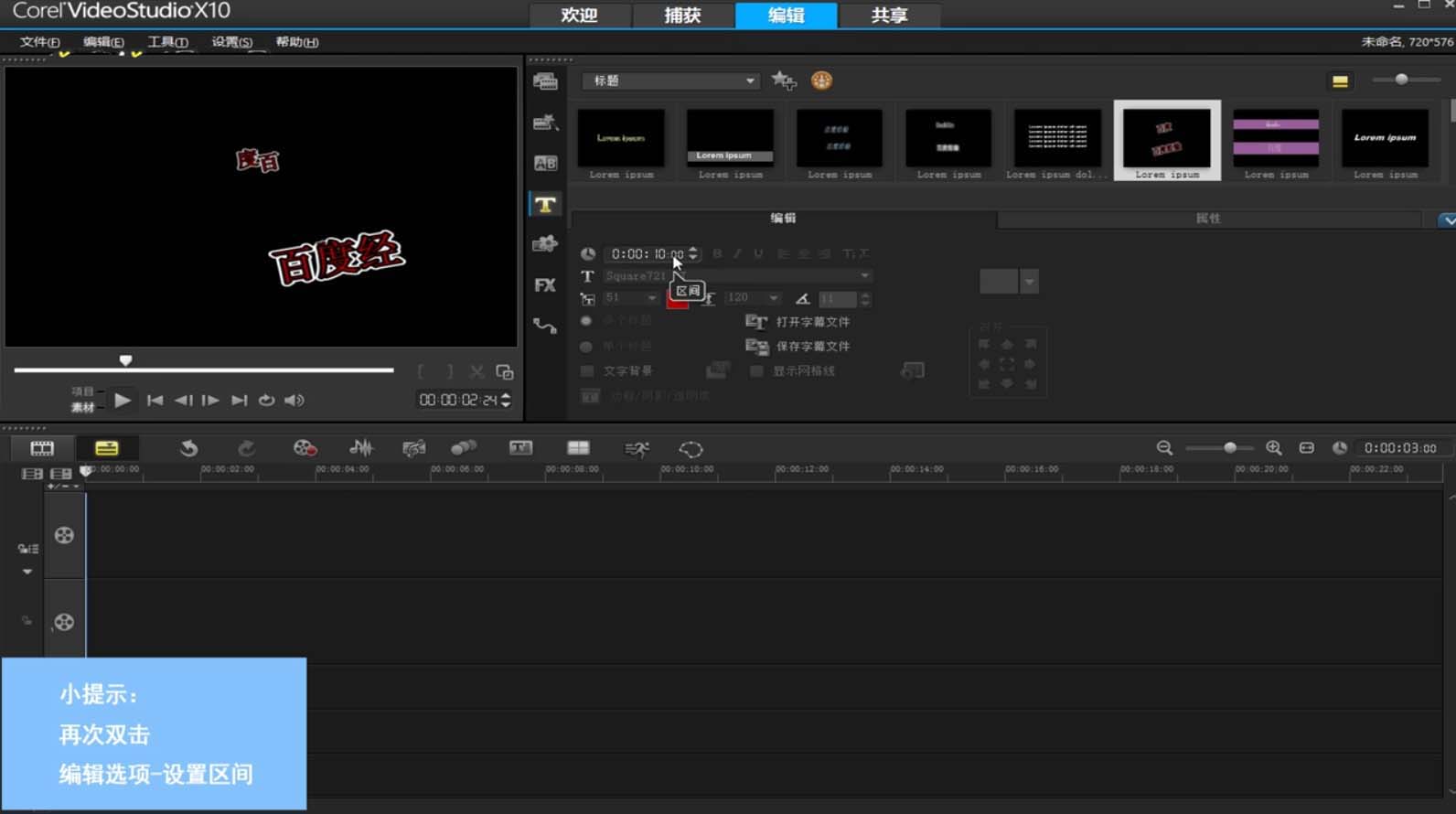 选择需要编辑的标题字幕,在编辑选项面板中可以设置字幕区间