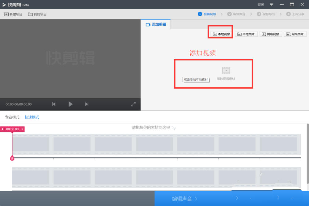2、进入之后,点击添加 本地视频 按钮 ,或者双击如图所提示的区域