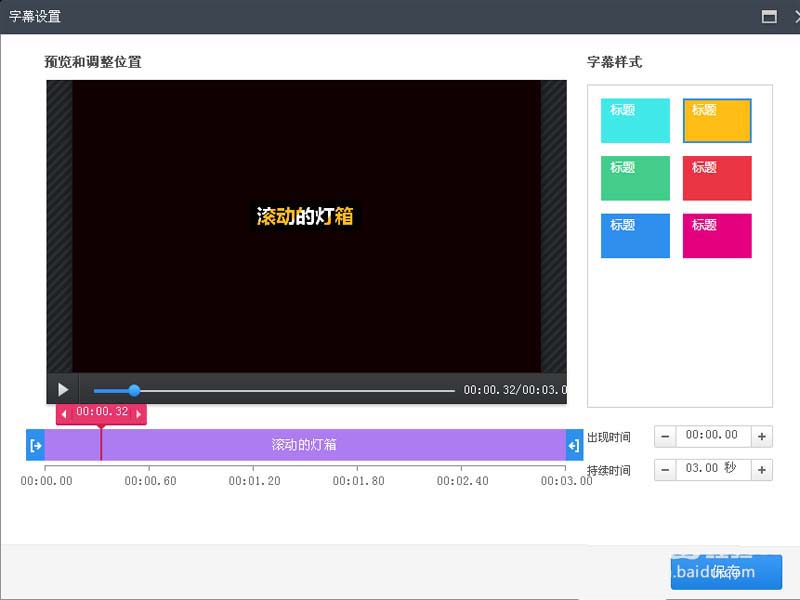 3、在字幕设置对话框中,输入文字内容,字幕样式选择黄色。