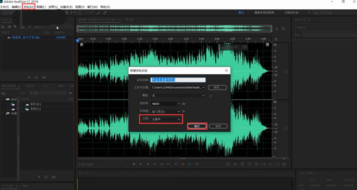 1、点击菜单栏中的“多轨”,在弹出的窗口“主控”处选择“立体声”,然后点击“确定”。