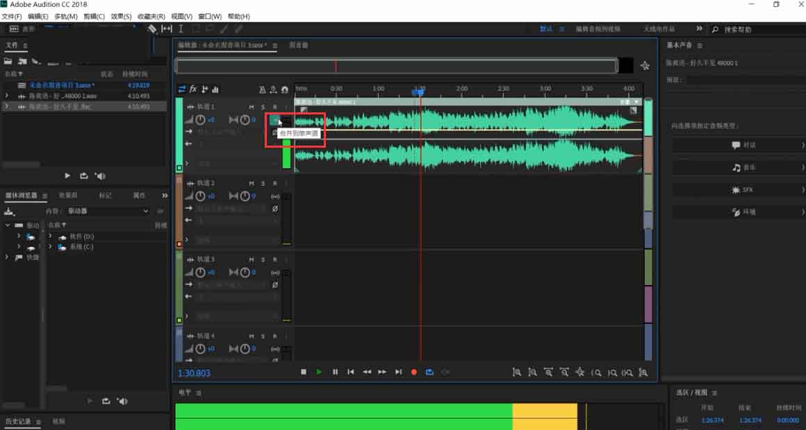 3、再次点击“合并到单声道按钮”即可取消设置,按空格键可预览播放效果。