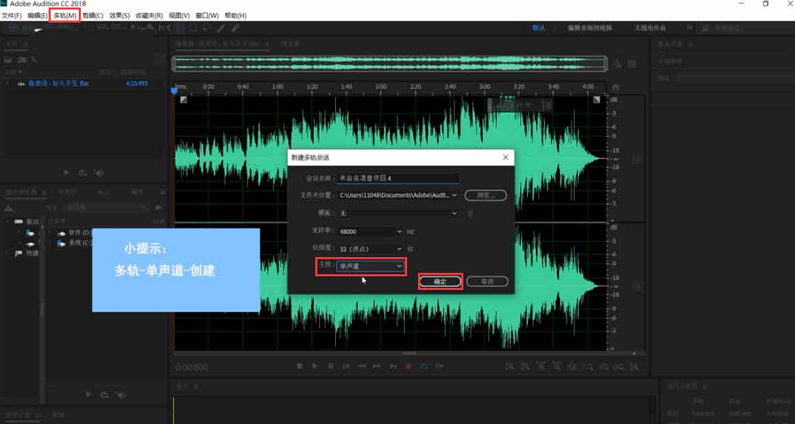 1、点击菜单栏中的“多轨”,在弹出的窗口“主控”处选择“单声道”,然后点击“确定”。