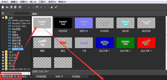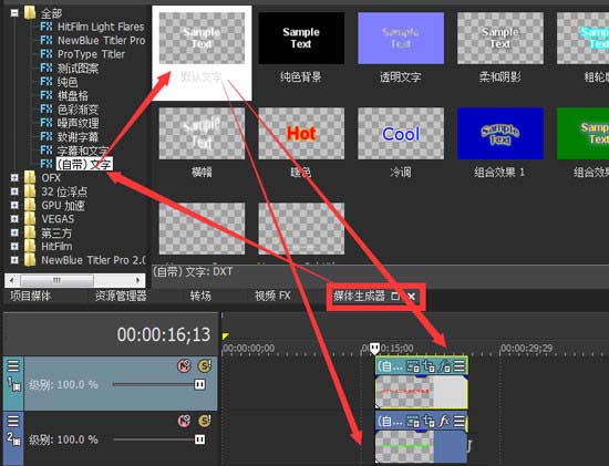 1、在软件主界面的左上角找到“媒体生成器”这一项,选择其下的“(自带)文字”——“默认”类型的文字,拖动到下方的时间线进行编辑。