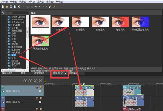1、点击软件左上角的“视频FX”,找到并选择“发光”这一项视频效果,拖动“白色柔光”(其他白色发光类型亦可)到文字的媒体上。