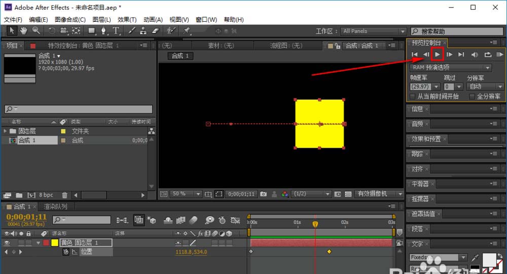 9、这样一个简单的动画就做好了,点击右上角预览控制台中的播放按钮,就可以看见一个运动的黄色方块了。