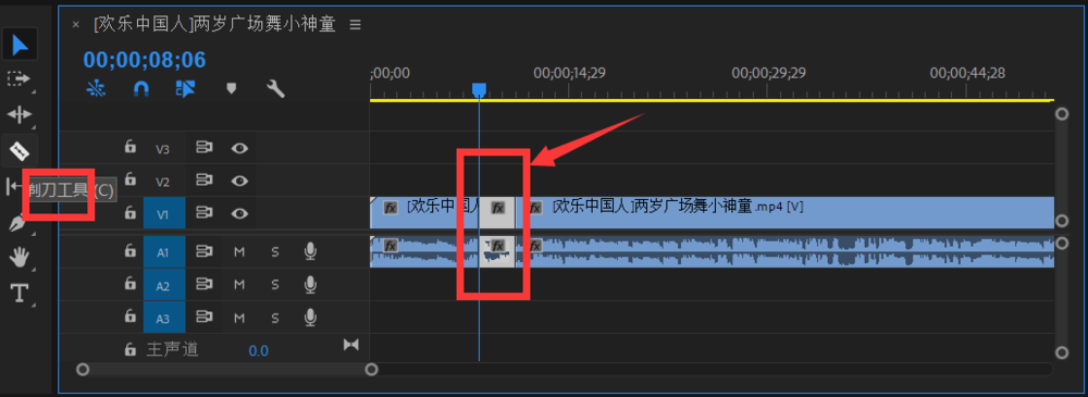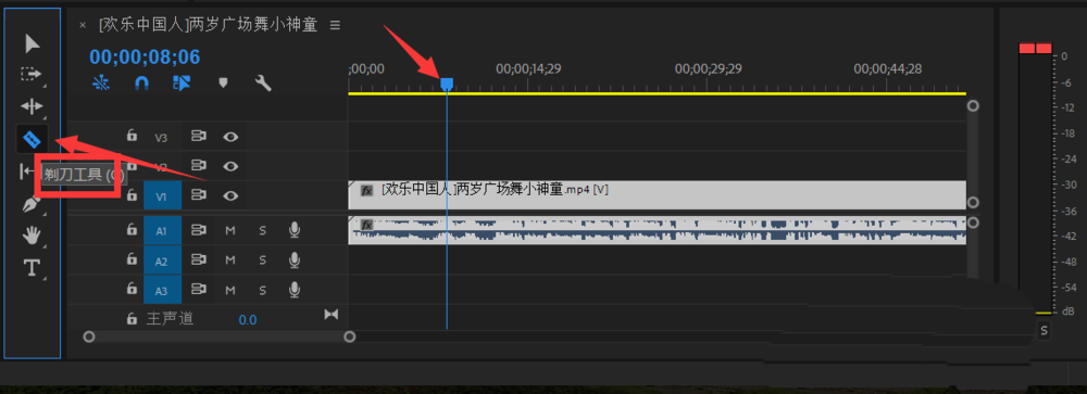 3、在时间轨上找到到需要放大特写的区域,选择剃刀工具,将起点截下来