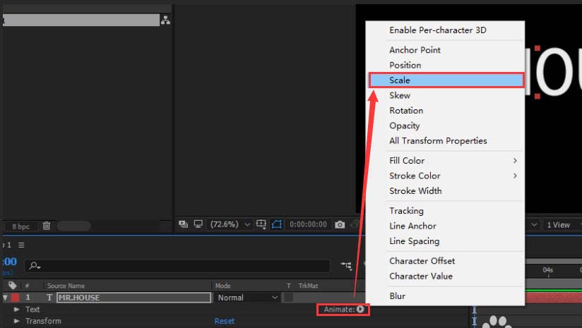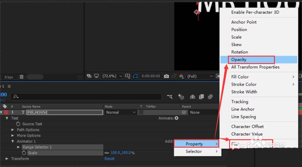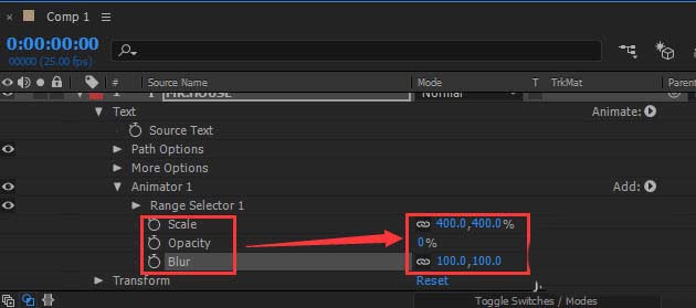 3、展开文字层,进入Text属性,点击animate(动画)增加scale(缩放),再给animator增加property(特性)--opacity(透明)和blur(模糊)