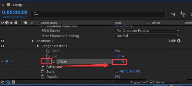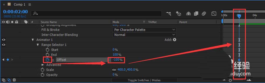 6、将offset调整到正100%,并点击码表添加关键帧,向前移动到2秒位置,把offset改为-100%。