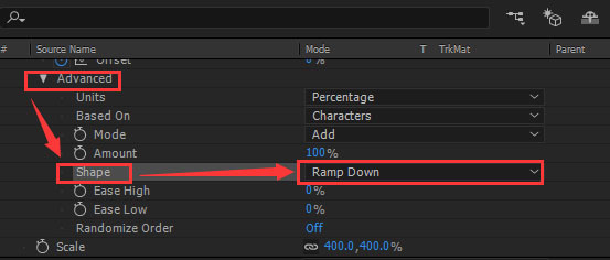 7、在advanced(高级)区域,把shape(形状)改为ramp down(下倾斜),这样文字进入的时候会很慢,同时在offset结束时动画停止所以不会像之前再回过来淡出了。至此整个标题动画就制作完成。