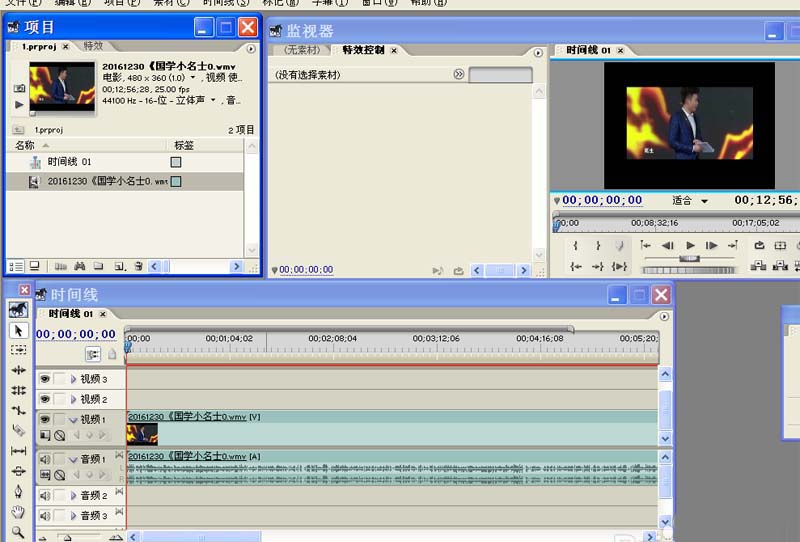 1、首先启动premiere7,执行文件-导入命令,导入视频素材后拖拽到视频轨道上。