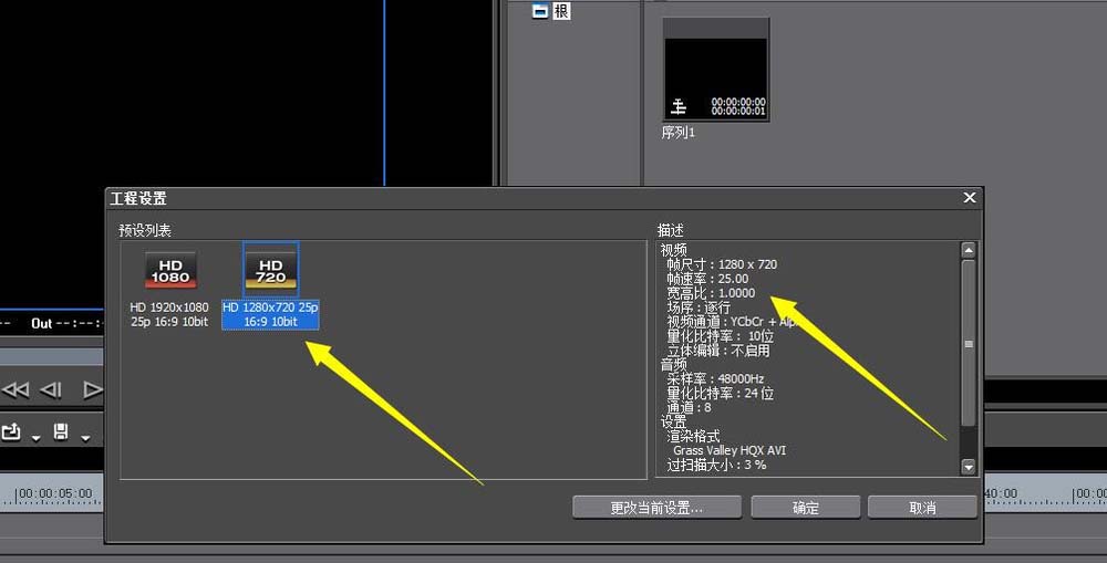 2、在这个界面显示的是当前的EDIUS制作的使用尺寸,右侧描述里面是详细信息