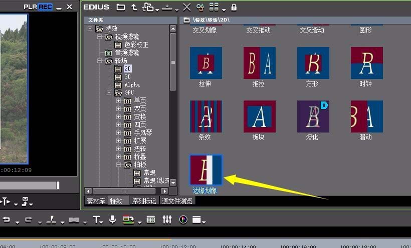 1、首先就是边缘划像的位置,边缘划像位于特效-转场-2D里面的最后一个