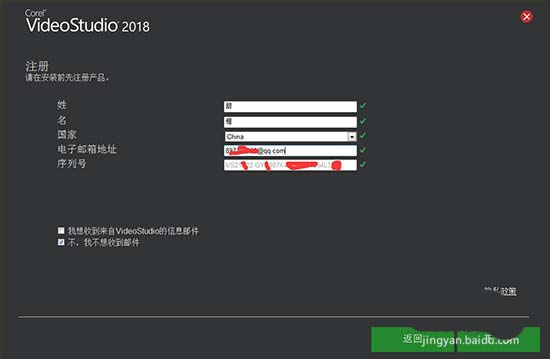 5、在安装前需进行注册,输入姓、名、购买邮箱后,选择是否想要收到来自videostudio的邮件后点击下一步。