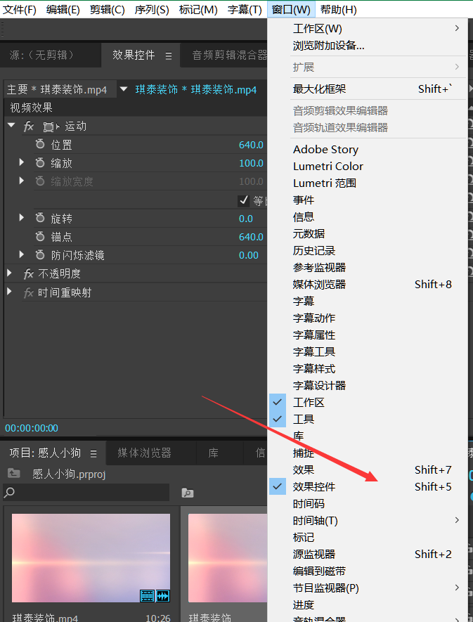 3、如果没有,说明没有打开面板,点击窗口-效果控件或者快捷键都可以。