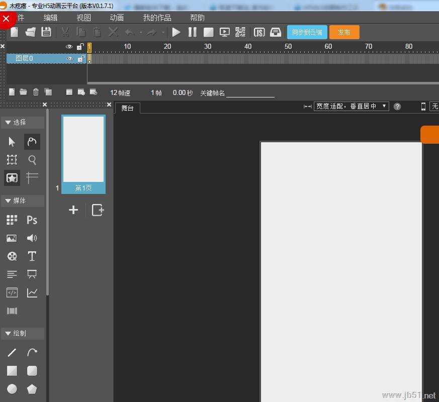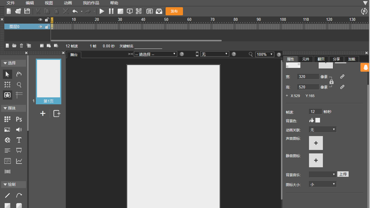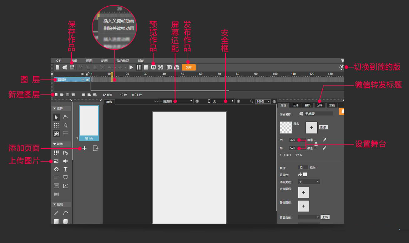 界面包括舞台设置、适配设置、安全框、预览作品、添加页面、添加关键帧动画、设置微信转发标题,如下图所示。