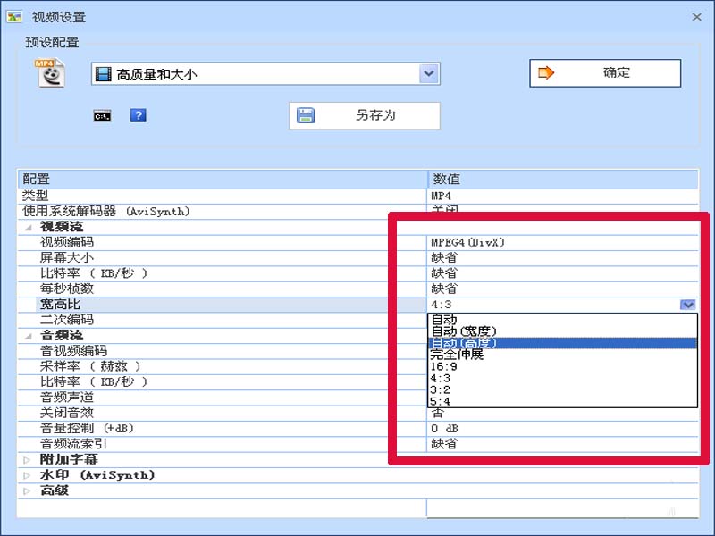 4、在下面的配置中找到宽高比选项,修改数值为4:3,点击确定按钮。