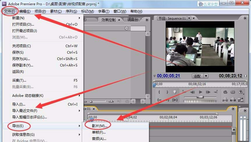 9、单击文件---->导出---->影片,就可以将配好音的项目保存为视频文件了。