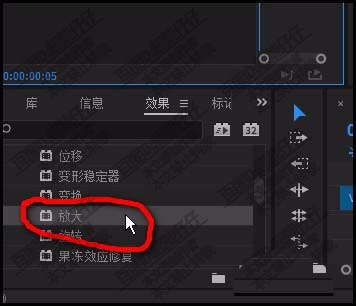 2、再在效果组中,找到:放大,这个效果。并拉给猫图。赋予了该效果给猫图