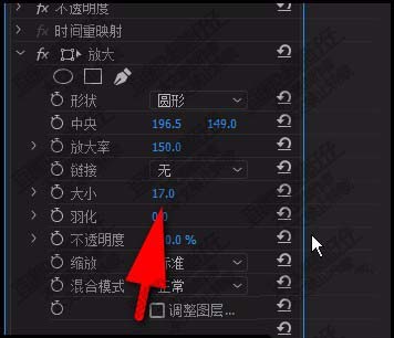 3、那么,放大这效果即显示在效果控件面板中。我们可以对此进行一些设置。