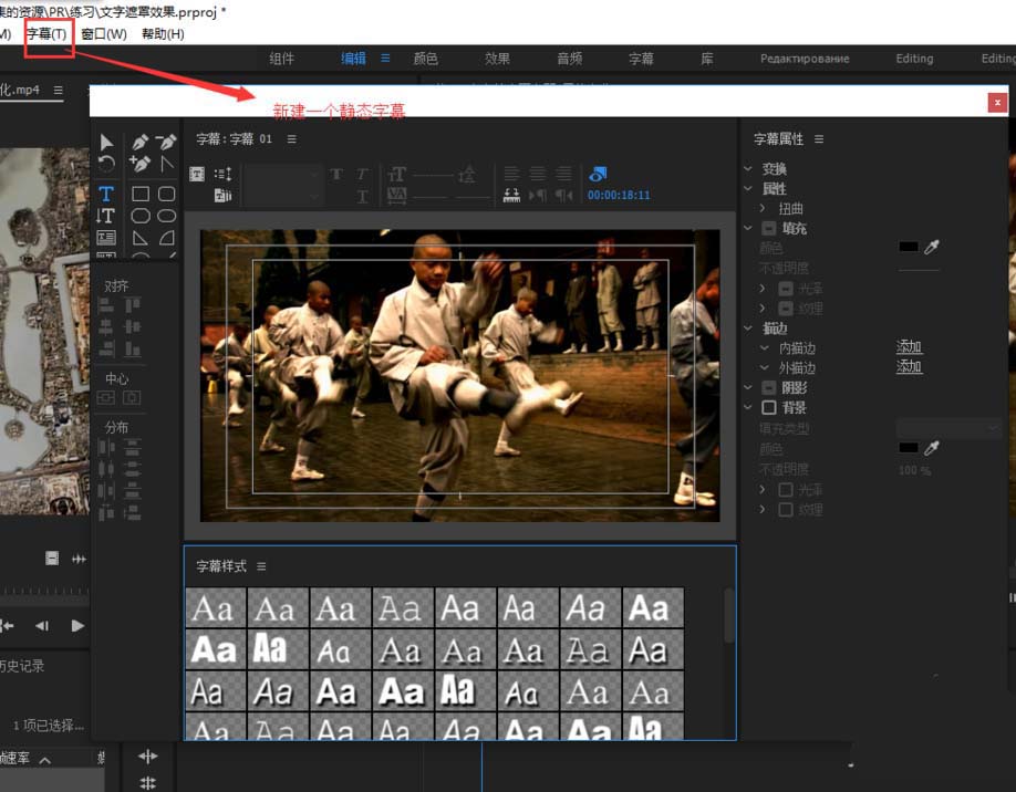 4、选择菜单栏中的字幕菜单,点击新建字幕,选择新建一个静态的字幕,然后会弹出一个字幕编辑窗口。
