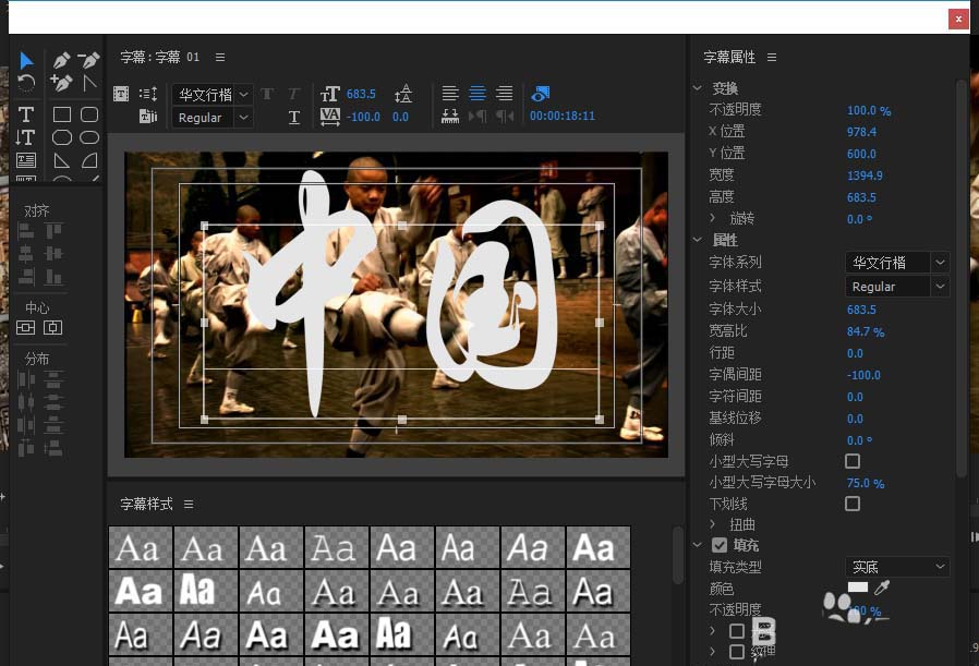 5、在弹出的字幕编辑窗口中,进行字幕的编辑,输入“中国”,然后设置调整好文字的大小字体样式与字体颜色等相应的属性效果。设置完成之后就可以直接退出字幕编辑。
