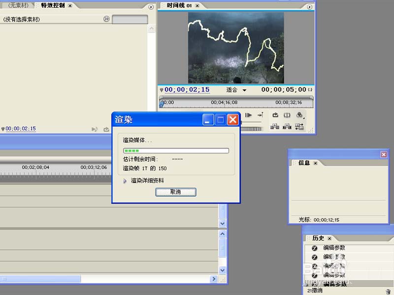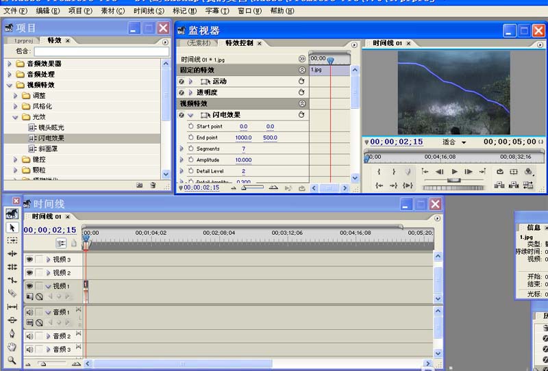2、执行特效-视频特效-闪电效果命令,将该效果拖拽到视频轨道1上。