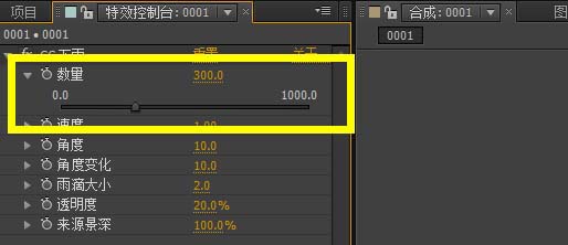 3、这时候特效控制台里面出现很多的选项,数量,速度,等等。