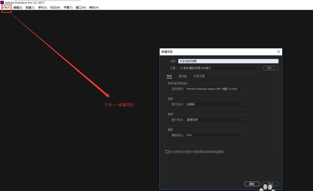 1、打开Premiere软件,点击文件新建,新建项目,在弹出的项目设置窗口中,进行相应的项目设置,比如说项目命名,选择存储位置等。设置完成之后点击确定创建即可。